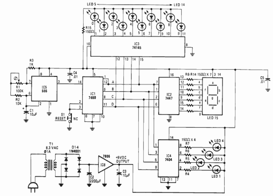 This is a device for those who need to show that they know how to use digital electronics but have no idea what to do. The device simply flashes LEDs and activates a display. The circuit is from a Radio Electronics Special projects from 1980.
