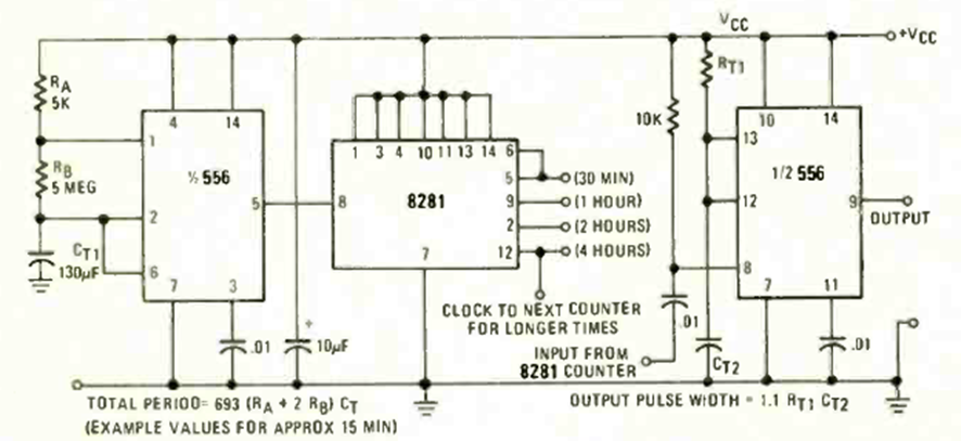 This long interval timer was found in the September 1976 issue of Radio Electronics magazine. The output can be used to control a relay. The circuit achieves timings of up to 14 hours.