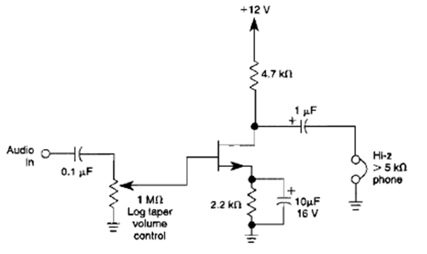 This high-impedance headphone circuit was found in a 1990s William Sheets. The power is low, but the high input impedance makes it useful for radio applications.