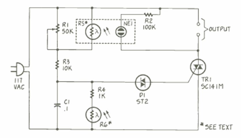 This circuit controls an external light that turns on at dusk and off in the morning. The circuit is from a Radio Electronics from October 1987.