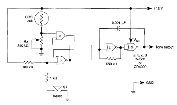 This latching light alarm was found in the 1995 Encyclopedia of Electronic Circuits Volume 5. The circuit is powered with 12 V to provide a signal to a power stage.