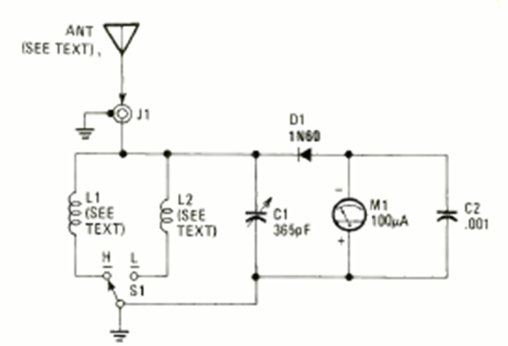 This simple circuit for the 3 to 30 MHz range was found in the Electronics Experimenter Handbook Special Projects of 1983. The coils consist of 10 and 50 turns of 32 wire on a 1 M x ½ W resistor.