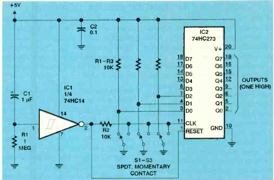 This circuit simulates a multi-position switch using programming buttons. The circuit is from an Electroics Now magazine from September 1998.