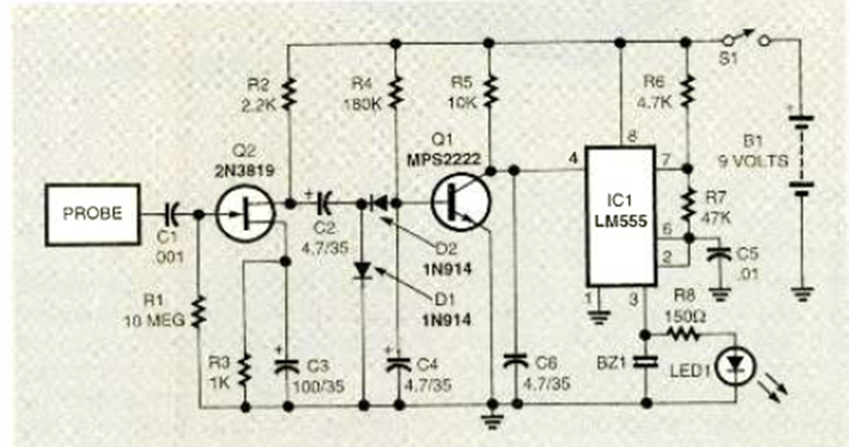 This circuit consists of an electrostatic sensor that can check if a cable is energized by simply approaching it. The circuit is from an Electronics Now from December 1998.
