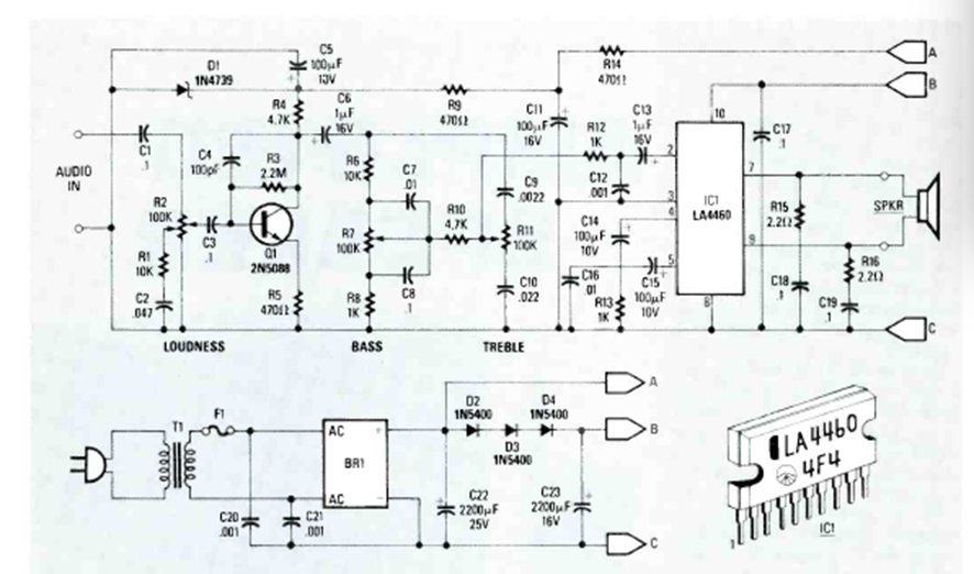 This circuit can be used as an amplifier for musical instruments or even with your cell phone. The circuit is old and was found in the 1990 edition of Radio Electronics Experimenter magazine.