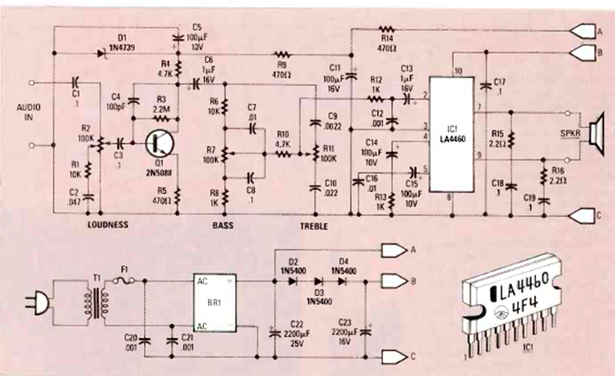 This amplified speaker is from a Radio Electronics from September 1988. The power integrated circuit is from that time and the other components are still common today.