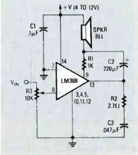 This 9 V amplifier has a gain of 20 and provides a power of a few hundred milliwatts. The circuit is from a Radio Electronics from March 1990.