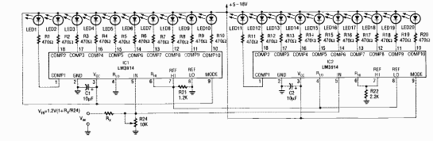 This circuit is an alternative to the previous circuit. We found it in the same article in the Radio Electronics magazine of March 1992. The integrated circuits are the LM3914.