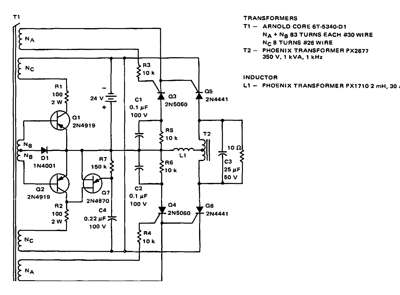 Suggested by Motorola in 1968 documentation, this circuit has an efficiency of 70%. Power transistors are types of the time as are transformers.