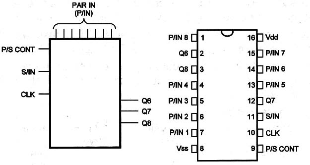 This package contains an 8-stage parallel input/ serial output shift register. Each of the 8 stages has its own JAM input. The outputs are available from the sixth, seventh, and eighth stages. All the outputs can sink or drain the same current.