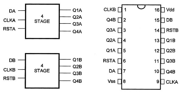 Two identical 4-Bit Static Shift Registers can be found in this package. They have serial input/ parallel output registers with independent Data, Clock, and Reset.