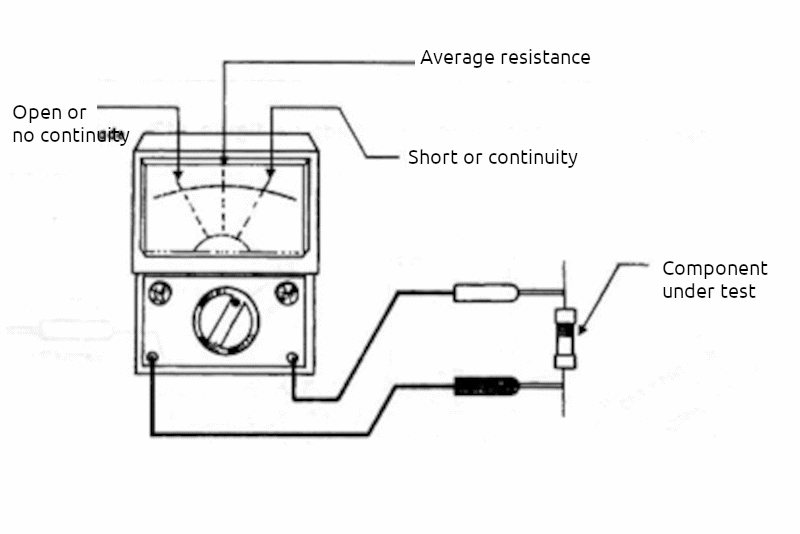 With the simple instrument that we will describe, continuity and resistance measurements, which are very useful in component testing, can be performed. Thus, resistance measurements of up to 50,000 ohms can be performed with good precision if the scale is previously calibrated based on resistors of known values. For general tests, we have the following type of operation: When the instrument's test leads are placed against the component being tested, we have the following reading possibilities, as shown in figure 1.