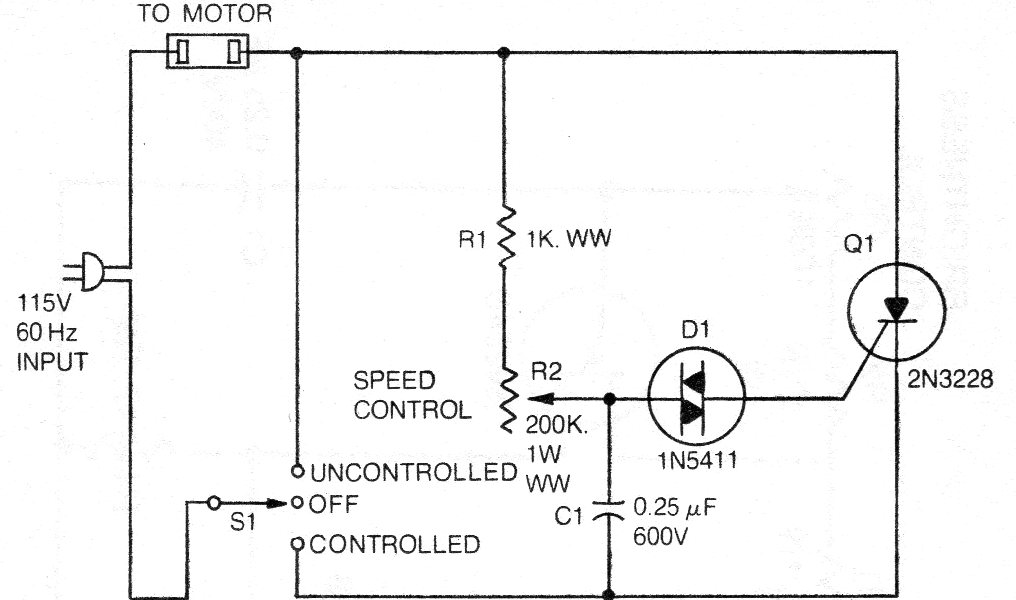 This circuit is from 1976 RCA documentation. The circuit uses an SCR that is no longer common but can be replaced by the ones in the TIC series with current according to the controlled motor. The SCR must be equipped with a heat radiator, the diac can be of any type and with appropriate components the circuit also works on the 220 V network. The control is half wave. The pot can be 220 k which is the most common current commercial value.