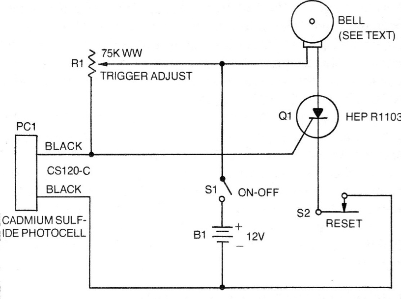 We found this circuit in an old documentation from the 70s. The sensor is an LDR that must be illuminated. The adjustment pot can be 100k or 220k. By installing the sensor in an opaque tube, we obtain greater sensitivity. We can exchange the original SCR for a TIC106 and instead of the 12 V buzzer or bell, we can use a relay to control an external circuit.