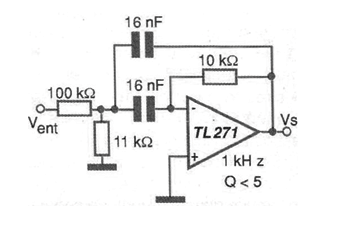 The circuit shown in the figure is suggested by Texas Instruments in its Linear Circuits Applications. It is a filter with a relatively low Q factor, less than 7. With the component values shown in the diagram, the tuned frequency is 1 kHz. Capacitors can be changed to tune to other frequencies. The values shown are components with low tolerances. If the application permits, commercial values may be used. The power supply is symmetrical and operational equivalent, with field effect transistors at the input can be used.