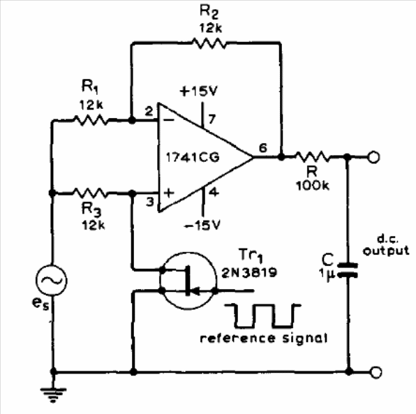 This circuit, found in a 1973 operational documentation, detects phase variations of the input signal in relation to the reference signal. The operating system can also be powered with lower voltages and other operational can be tried. The circuit operates with signals at the frequency of the power grid.