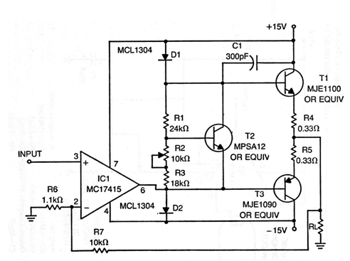 The components of this circuit from the 70's are no longer common on the market, but it is possible to assemble it with equivalent tests. Thus, we can use the TIP31 and TIP32 stop for the output and the BC548 for T2 that must be glued to the heatsink of one of the output transistors. For IC1 we can use an integrated circuit 741. The power supply must be symmetrical with at least 1 A of current and the load is 4 ohms for the indicated power. The diodes can be 1N4002. The input impedance of the circuit is high.