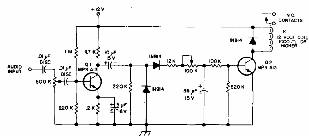 We found this circuit in a 1974 documentation. Upon receiving an audio signal, it activates a relay with a delay that is set in the 100k pot. The transistors can be the BC548 and the relay must be of the sensitive type of 12 V. The audio signal must come from an amplifier or a piezoelectric capsule. Components with non-standard values can be approximated by current values.