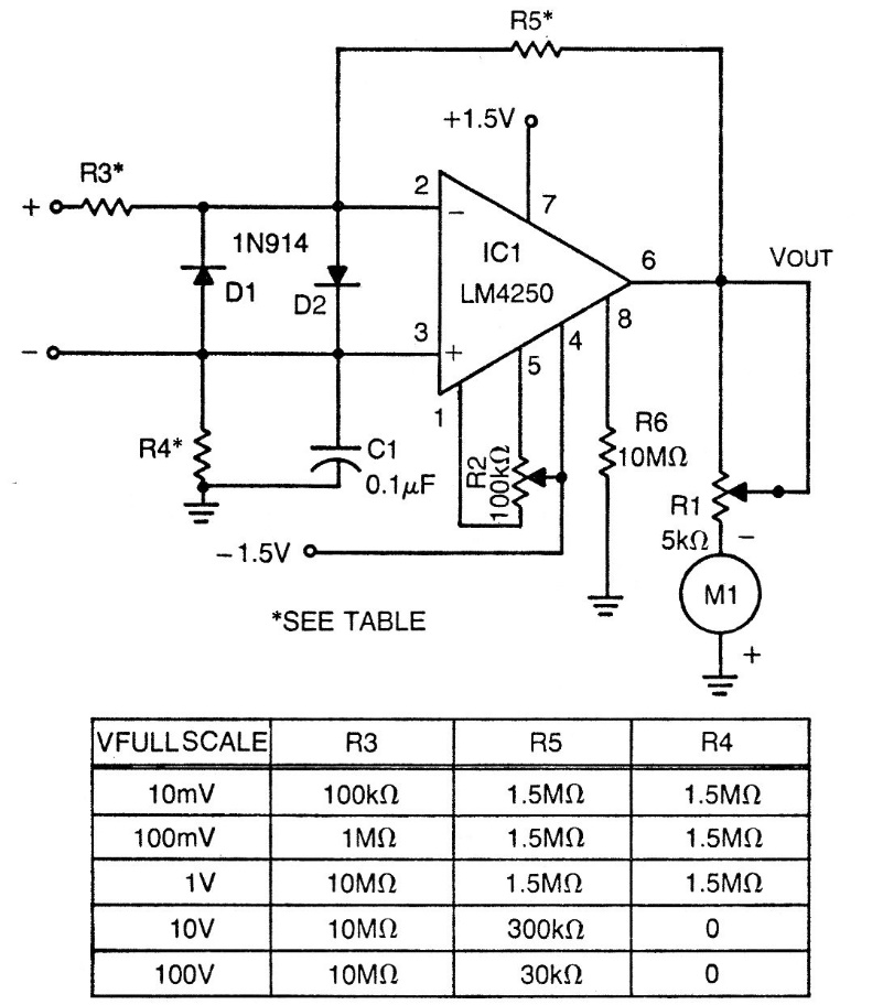 The operational amplifier used in this circuit from a documentation from the 70s is no longer easy to obtain. However, we can assemble the circuit with a more modern operating system such as the 741. The circuit measures voltages in 5 ranges, depending on the components. A selector switch can be added to the circuit to make the selection of the components, according to the table given next to the diagram. The power supply, for amplifiers like the 741, must be symmetrical with voltages between 6 and 12 V. Operational amplifiers that operate with lower voltages can be used. The instrument is a 0-1 mA milliammeter.