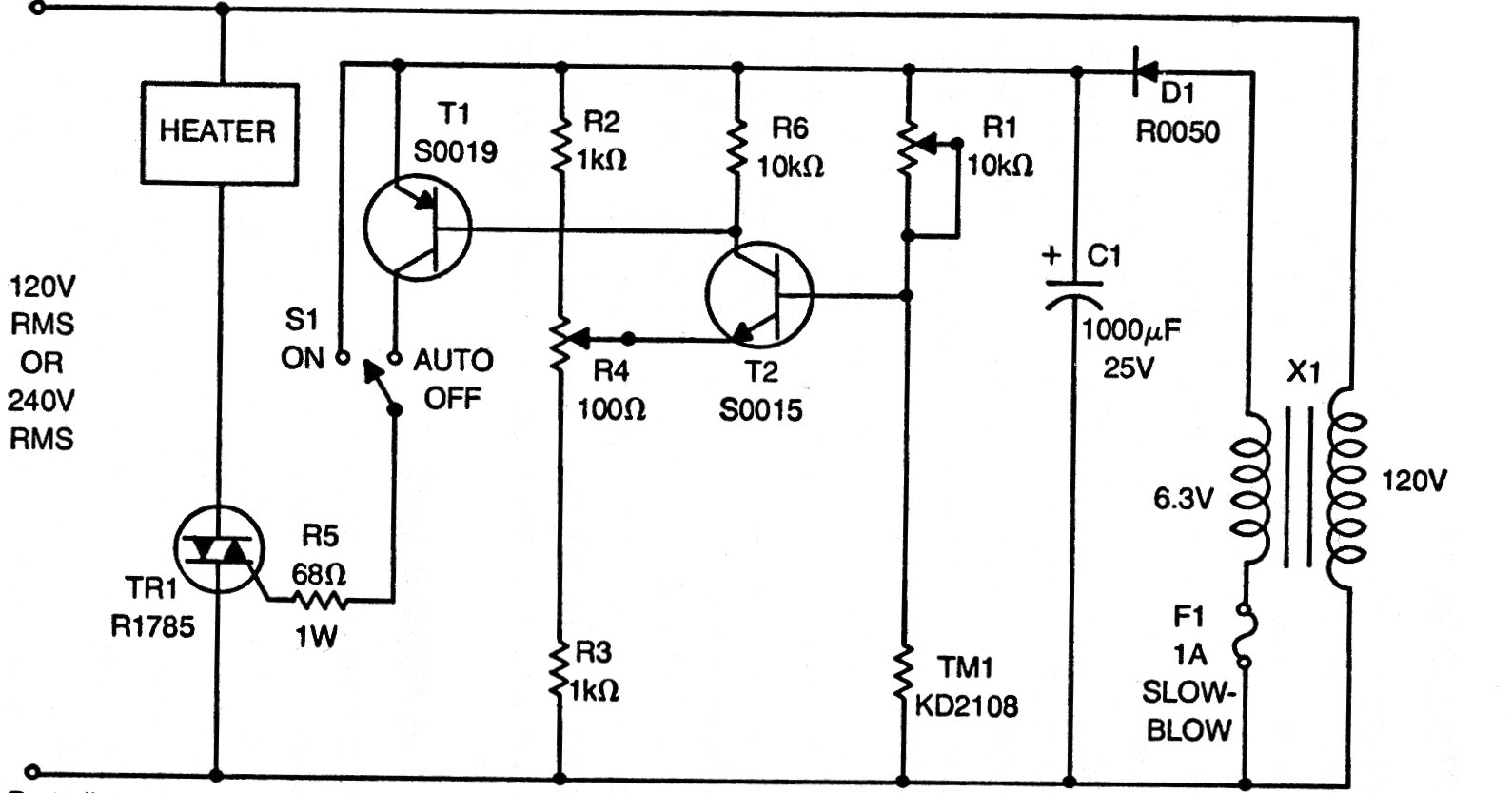 We found this circuit in an old documentation from the 70s, but it can be assembled with modern components. T1 can be a BC548 and T2 a BC538. The TM1 sensor is an NTC of approximately 10k of resistance. The Triac can be of the TIC series with current capacity according to the heating element. This component must be mounted on a good heat radiator. The NTC must sense the ambient temperature, set to R1. D1 can be a 1N4002 and transformer X1 has a secondary of 200 mA or more of current. For the 220 V network, the transformer must have a primary according to this voltage.