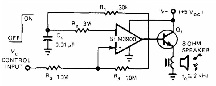 This circuit is from a 1977 publication, serving to produce sound effects in games, as it is triggered by a digital signal. The output transistor can be a BC548 and the supply is made with 5 V. The resistors of non-common values can be approximated by the current standards. The speaker can have impedances of 8 to 100 ohms, depending on the intensity of the desired sound.