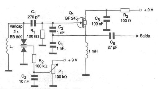 The great advantage of the circuit shown in the figure is the fact that its frequency is controlled by a continuous voltage. This allows the circuit to be used in conjunction with digital to analog converters (DAC) by controlling the frequency either through the parallel output of a PC or by a microprocessor. The varicap can be of the double type as shown in the diagram or, failing that, two separate varicaps such as BB809 can be used, which are relatively common in our market. The coil, formed by 40 turns of wire 28 in a 1 cm diameter tube, causes the circuit to generate signals centered at approximately 3.5 MHz. The capacitors used in the circuit must be ceramic and the junction field effect transistor (JFET) admits equivalent as the MPF102. The circuit can generate signals up to a few tens of megahertz just by changing the coil to the desired range. The width of the swept band depends basically on the characteristics of the varicap used.