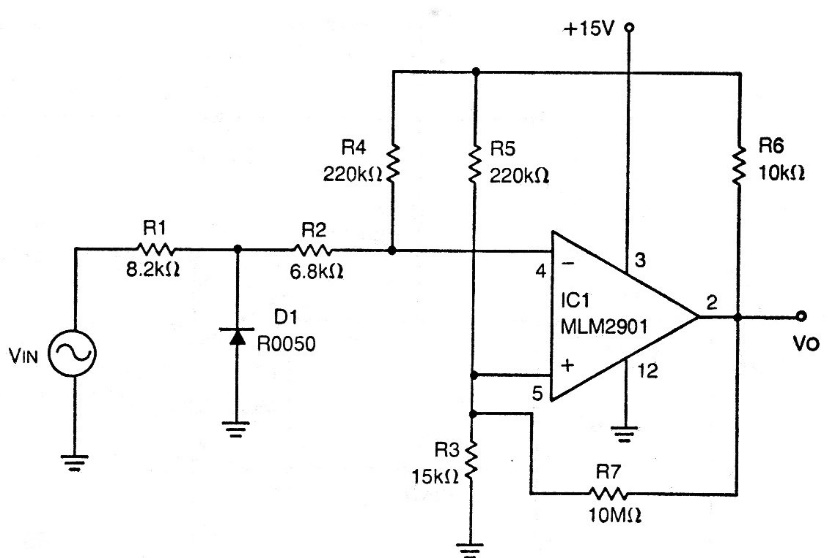 This “zero crossing detector” detects when a signal passes through the zero-volt point producing an output pulse. This type of circuit is widely used in power controls. The circuit is from 70s documentation, using an operational one that is not easy to obtain. Equivalent operations can be used, such as the 741. The power can be changed depending on the operation used. Resistor R1 depends on the strength of the input signal.