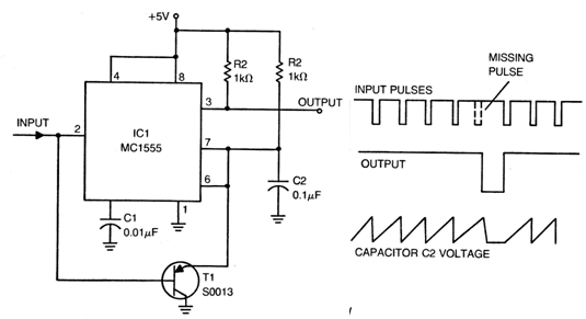 This traditional detector configuration is from an old publication where the MC1555 is the Motorola version of the 555 and the transistor can be the BC558. The signal generated by the circuit when a pulse in a sequence fails is shown next to the diagram. The power can be from 5 to 12 V depending on the type of application. The maximum duration of pulses and frequency is given by the characteristics of the 555.