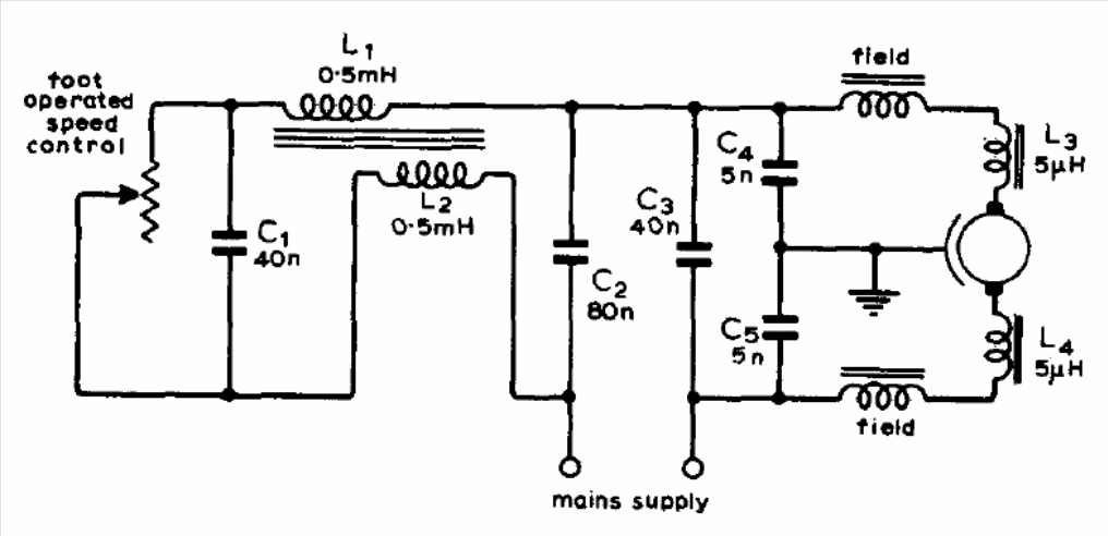 We found this configuration in a 1974 technical documentation. The circuit consists of a filter to prevent interference caused by sewing machine engines. Capacitors must be ceramic for 400 V and their values can be approximated by current standards.