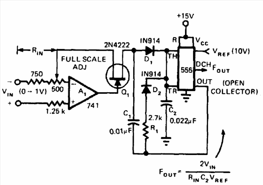 This circuit was found in a 1974 publication. It converts the applied voltage into pulses of corresponding frequency. So, we have a factor of 10 kHz for its operation, which means that a voltage variation from 0 to 1 V at the input produces pulses from 0 to 10 kHz. The 741's power must be symmetrical, and the FET can be the BF245.