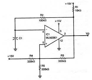 The operational amplifier used in this circuit of an old documentation no longer exists, but the circuit can be implemented with a modern one like 741. The frequency is determined by C1 which can have values between 1 nF and 470 nF. The circuit does not need a symmetrical source and the voltage can be lower for the most modern operating systems. The maximum frequency depends on the operational amplifier used.