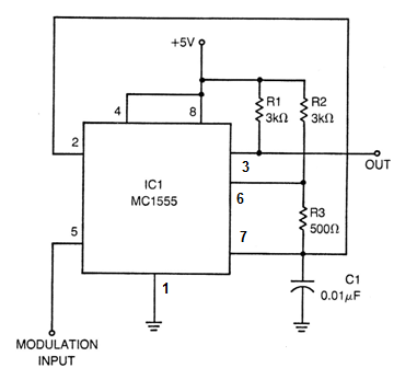 There is nothing new in this configuration of an old document that used the MC1555, Motorola's version of the CI 555 from the 1970s. Frequency is calculated in the conventional manner as our website indicates in the math section. The maximum frequency is around 500 kHz and the supply can be made with voltages from 5 to 15 V. This circuit has a modulation input.