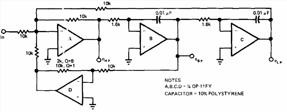 This second-order filter was found in a 1978 publication and can use common operational amplifiers like the 741. The source must be symmetrical, and the capacitors can be changed for operation at other frequencies.