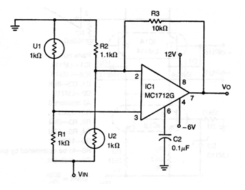 This circuit was found in an American documentation from the 70s, but it can be implemented with a modern operational system like the 741. We recommend changing the values of R1 and R2 according to the NTCs used, and they must have the same order of value. And, to help put the bridge in balance, a trimpot can be added so that the sum of the value of the trimpot with a series resistor is double the NTC used. For example, for a 10k NTC, use a 22k trimpot in series with a 1k resistor. The circuit detects when the two NTCs are at different temperatures. The supply voltage can be changed according to the operational used.