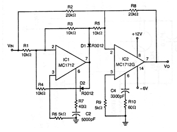 This configuration is from an old Motorola documentation from the 70s. The circuit uses operations that are no longer common but can be assembled with more modern operational amplifiers. The diodes are for general use and the voltage can also be changed according to the characteristics of the operating devices used. Note the use of two opposing electrolytes for an alternating voltage input. The circuit provides the absolute value of the input voltage at the output.