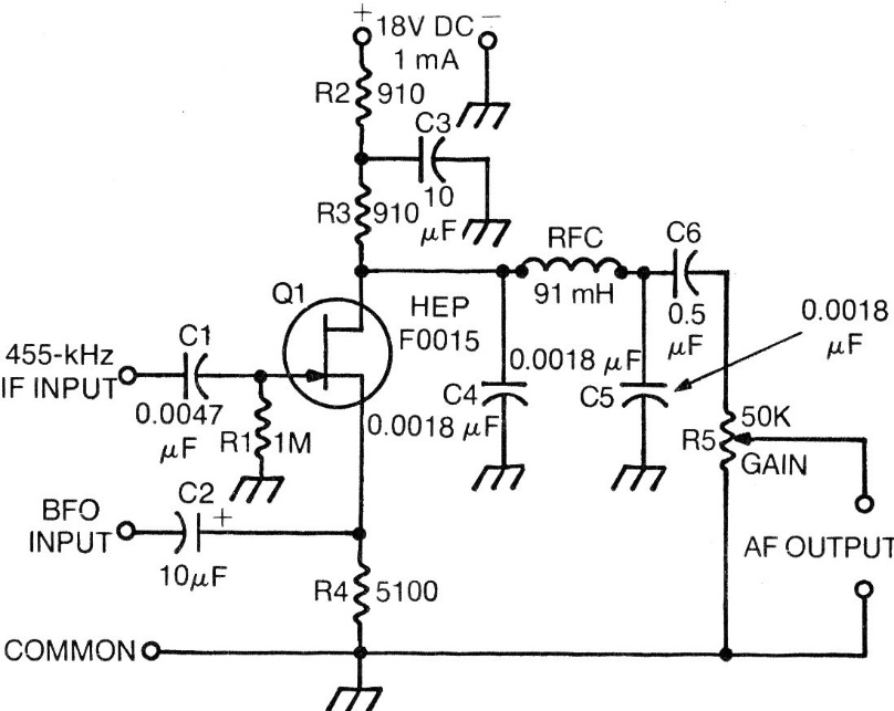 This circuit is from 1976 documentation, but it can be assembled with more modern transistors like the BF245 and MPF106. The circuit has a consumption of only 1 mA. Its application is in the reception of SSB signals (BLU) providing an audio output directly to an amplifier. The circuit is connected directly to the FI and to the output of a beat frequency generator (BFO).