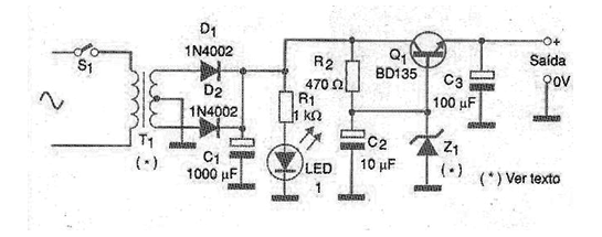In the figure we present an extremely simple circuit of a voltage source regulated by a zener diode. Depending on the transistor used, we can obtain currents of up to a few amps of output. We observed that the zener diode must have a voltage of 0.6 V more than the desired voltage at the output, since there is a voltage drop of this order at the base-emitter junction of the transistor. The power dissipated by the transistor, which must be mounted on a good heat radiator, will be given by the product of the difference between the input and output voltage, by the current drained by the load. The dissipation of the zener diode depends on the gain of the transistor, and the current in that component must be determined and multiplied by its voltage. Typical applications for this power supply are for powering small low voltage devices (between 3 and 12 V) that require currents up to approximately 1 A.