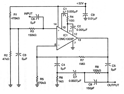 This circuit is from old Motorola documentation, from the 70s. The integrated circuit is difficult to find today, but changes can be made to use more modern operational equivalents. Types that have external compensation terminals should be chosen. The source may also be of a lower voltage. Consumption is low and signal cables must be shielded. For a stereo version, a circuit must be installed for each channel.