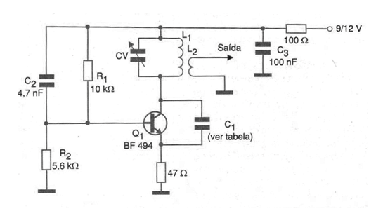 The configuration shown in the figure is one of the most traditional when it is desired to produce signals in the range from 30 MHz to 800 MHz. The maximum frequency that can be obtained from this circuit depends only on the used transistor and the coil. The supply can be done with voltages from 6 V and the consumption of the oscillating step is quite low. The capacitors used must all be ceramic. Capacitor C1, which provides feedback to maintain oscillations, depends on the frequency. Thus, in the following table we give the characteristics of this component and the coil for different frequency ranges.