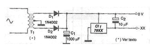 In the same way that we can regulate the voltage in the positive branch of the circuit, we can have the negative regulation. For this purpose, we can count on the 79xx series integrated circuits, where the xx can vary from 05 to 15 indicating, voltages from 5 to 15 V. In the figure we have the complete circuit of a negative voltage source, using a series IC 79xx. It should be noted that the terminal arrangement on ICs 79xx is different from ICs 78xx. The integrated circuit must be equipped with an appropriate heat radiator and the output decoupling capacitor may have different values than indicated, according to the manufacturer of the CI. The transformer must have a secondary winding with a voltage of at least 2 V more than the voltage desired at the source output, that is, the voltage of the used regulator.