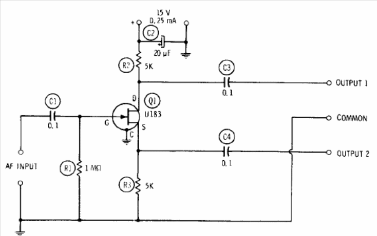 This circuit was found in a 1977 documentation. The gain is 3 dB and instead of the original transistor, the BF245 or MPF102 can be used. The outputs provide signals with opposite phases. The input frequency can be up to 50 kHz and the power can be between 9 and 15 V.