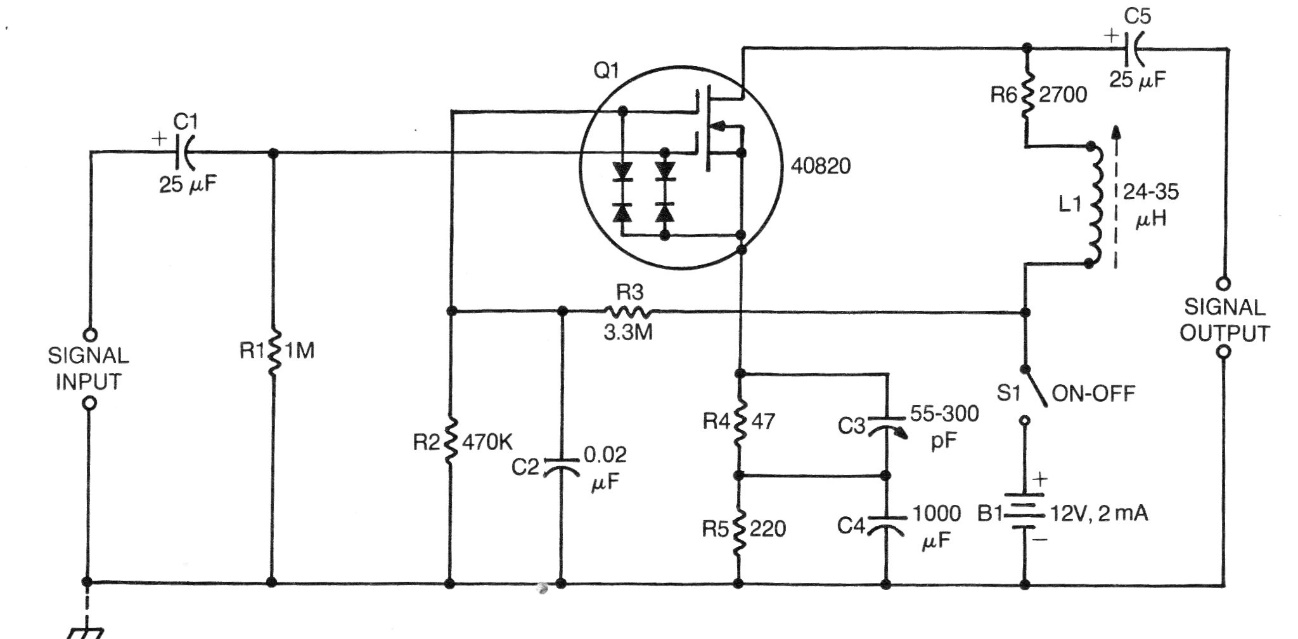 This circuit is from RCA documentation from the 70s. The dual-gate MOSFET is not very easy to obtain, but the other components are common. This circuit has an excellent gain in a frequency range that goes up to about 10 MHz. The amplitude of the output signal reaches 1 Vrms. The components can be changed according to the desired characteristics. The consumption is very low, around 2 mA.
