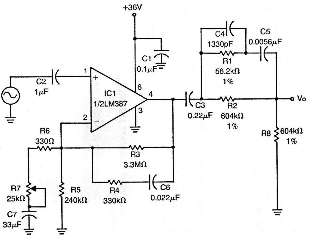 This circuit was obtained in a publication that no longer exists in the 70s. The integrated circuit used is the LM387, not very simple to obtain, but the circuit can be changed to operate with a common operating system like the 741 and a lower voltage (9 to 15 V) power. The circuit makes the RIAA reverse equalization transforming the output of a recording into linear, which can be interesting for recovering vinyl recordings, moving on to other media. The signal cables must be shielded, and two units must be mounted, one for each channel. For practical assembly that is not accurate, components of approximate values can be used, especially the 1330pF capacitor, which may be 1.2 nF.