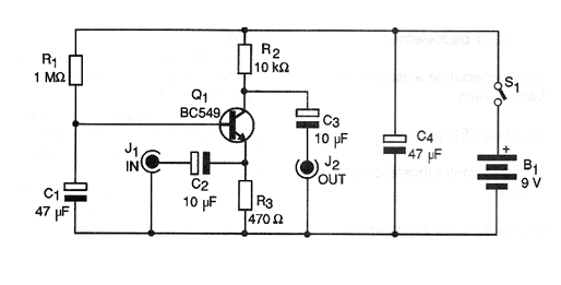 The first circuit we present is ideal for matching the low impedance of transducers, such as microphones or even telephone pickups, with the high input impedance of an amplifier or even a common sound mixer. In the figure we have the complete circuit of this preamplifier, which can be powered with a 9 V battery or from 4 small batteries. As the current consumption is very low, a battery will have enormous durability when feeding this circuit. What we have is an amplifying step in the common base configuration. As is known, this configuration has a very low input impedance and a high output impedance. The current gain is low, but the voltage gain is high. We use a high-gain, low-noise transistor to provide better results. The reader will be able to use this adapter circuit with sources of impedance signal of up to 600 ohms. The resistor R3 can have values between 22 ohms and 470 ohms depending on the impedance of the signal source.
