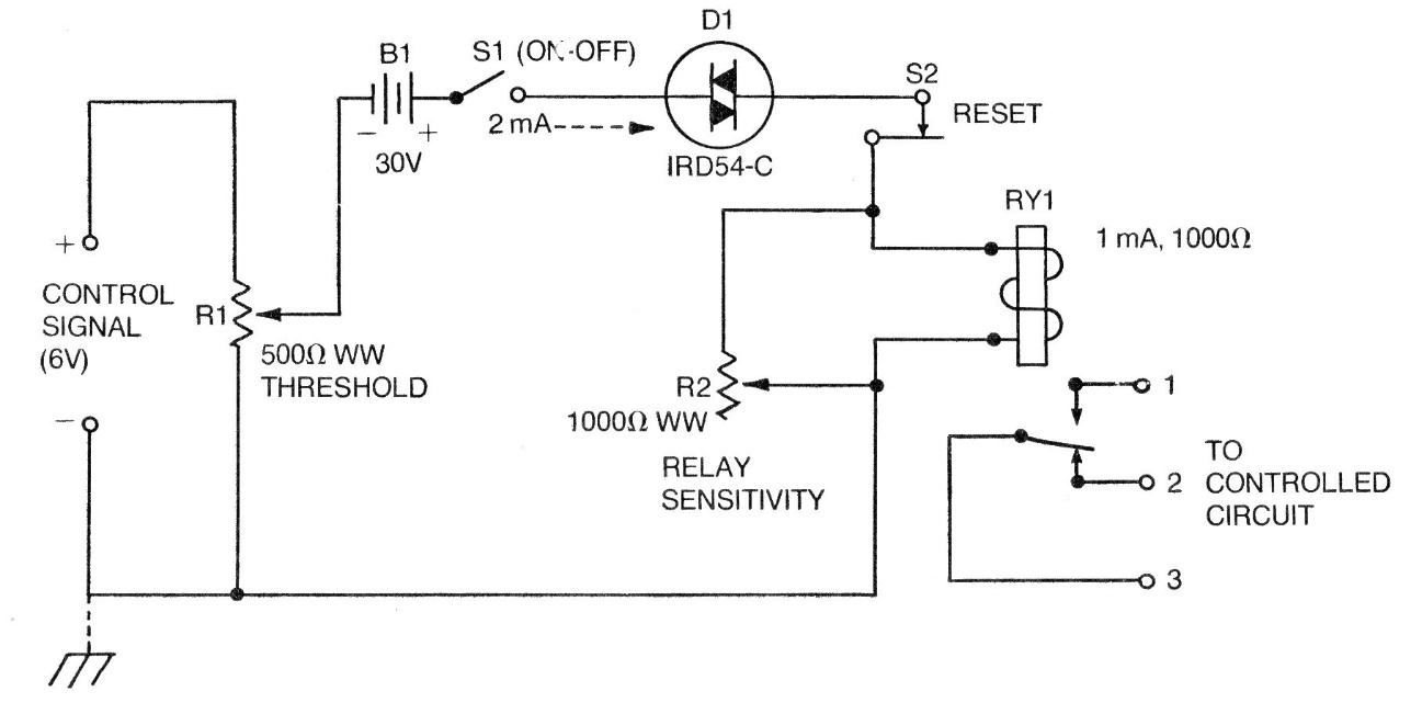 This circuit makes use of a diac to stop the activation of a sensitive reed relay 1 mA. The trip threshold is set at R2 and the trip voltage at R1 which can be a 470 ohms wire pot. The circuit is from an old publication from the 70s. The components can be changed according to the characteristics of the components used.