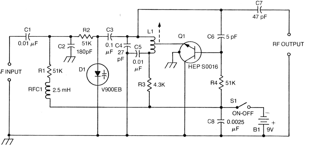 This circuit can serve as the basis for a small FM transmitter with varicap. We found it in a publication from the 70s and the transistor could be the BF494. Any varicap from the BB series can be used. The power comes from a small 9 V battery. We can connect the antenna to the RF output and use a ceramic microphone on the modulating input. The coil consists of 2 + 2 turns of wire 28 in a 1 cm diameter shape. The range will be a few tens of meters. The components can have their values approximate to the current standard ones.