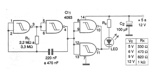 The configuration shown in the figure is quite simple and can be used to activate a signaling LED on the machine panel or even some warning devices. The use of high-brightness LEDs can be analyzed, and an exciter transistor must be added for this purpose. In this configuration, two of the 4093 ports are used in an oscillator where the frequency depends on R1 and C1. The values of these components must be obtained experimentally according to the application. The other two ports are used as digital amplifiers for driving an LED. The value of the resistor connected in series with the LED depends on the supply voltage, observing the table given next to the diagram. The supply can be done with voltages from 5 to 12 V. Batteries can be used as a power supply for the case of common LEDs, given the device low consumption.