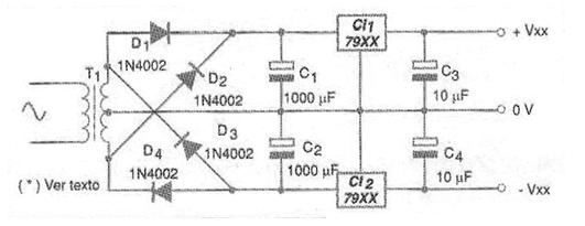 In most circuits where operational amplifiers are used, a positive voltage and a negative voltage are required for the supply. These voltages are obtained from a symmetrical source or source of two voltages, one positive and one negative. In the figure we have a power supply circuit from 6 to 15 V, depending only on the transformer and the regulator integrated circuit used. In fact, what we have is a source that combines the two previous circuits, in one having a unique land reference. The transformer must have a secondary with a voltage of approximately 2 volts more than the desired voltage at the output of the symmetrical source. For example, for a 12 + 12 V source, use a 15 + 15 V transformer. The maximum current of this source is 1 A and this must be the maximum current of the secondary of the used transformer. Voltage regulator integrated circuits must be mounted on heat radiators.