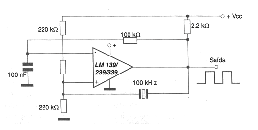 Frequencies up to just over 100 kHz can be obtained with an oscillator based on one of the four voltage comparators on the LM139 / 239 or 33i9 integrated circuit, as shown in the figure. The supply can be made with voltages from 5 to 12 V and the signal obtained at the output is rectangular with an active cycle of approximately 50%. The other comparators of the same integrated circuit can be used in other applications since they are independent. Observe the existence of the pull-up resistor necessary for the circuit since its output is made with a transistor with the collector open.