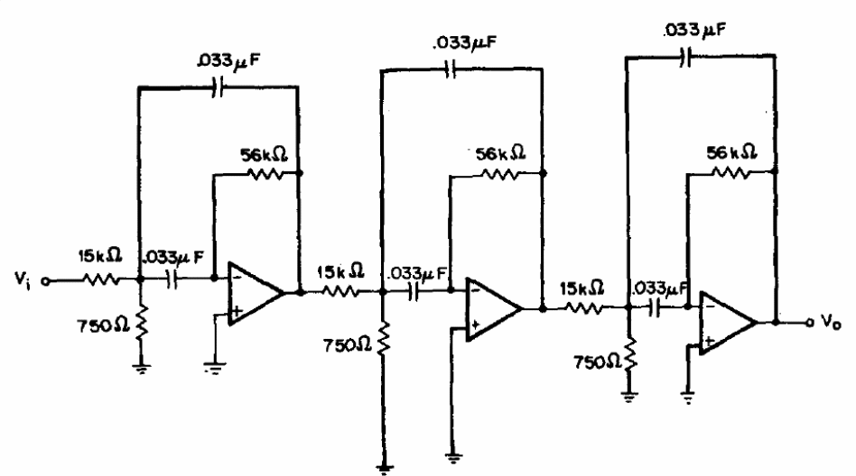 This circuit has a gain of 6 and a Q factor of 8.63. Operational amplifiers are common, like the 741, and the power supply must be symmetrical. The components can be changed for operation on other frequencies.